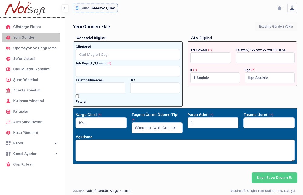 Noisoft Otobüs Kargo Yazılımı’nın en önemli modüllerinden biri olan Yeni Gönderi Ekle ekranı, kargo kayıt süreçlerini hızlı, hatasız ve kullanıcı dostu şekilde yönetmek için tasarlanmıştır.