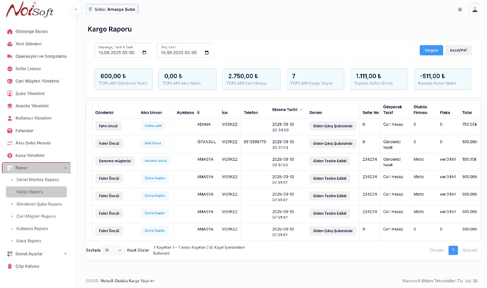 Belirli bir şubenin yaptığı tüm gönderilerin raporudur. Şubenin performansını, tahsilatlarını ve yaptığı seferleri analiz etmek için kullanılır.