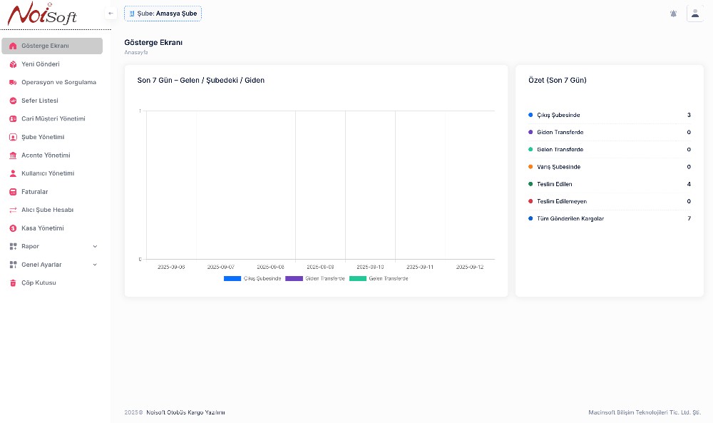 Gösterge Ekranı, şubelerin son 7 güne ait tüm kargo operasyonlarını özetler. Grafik ve istatistiklerle desteklenen bu ekran sayesinde yöneticiler ve personel, şubelerinin performansını ve iş yükünü anında görebilir. Operasyonel süreçlerin genel bir fotoğrafını sunarak karar alma sürecini hızlandırır.